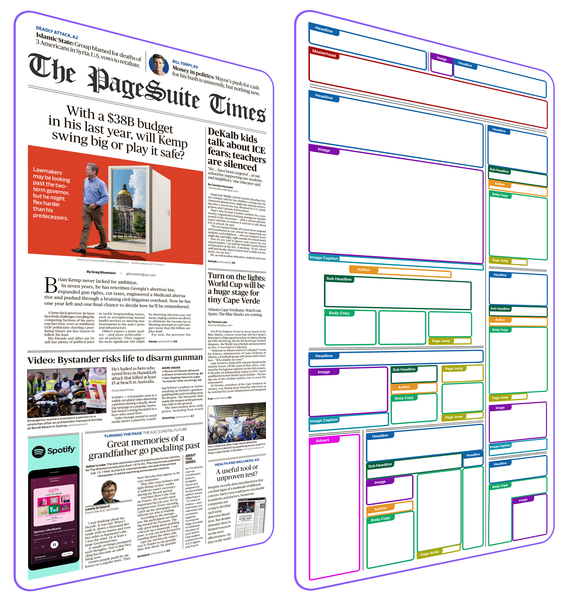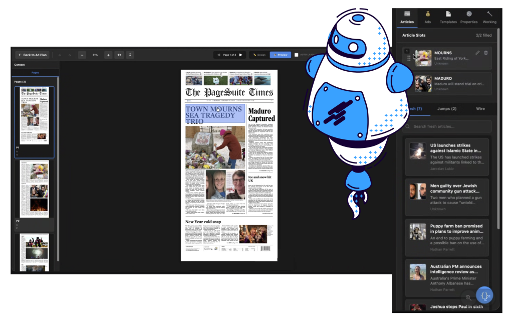 Traditional digital newspaper publishing faces an impossible equation: create newspaper-quality layouts across hundreds of pages, multiple sections, and constantly updating content feeds – all while maintaining brand consistency, managing article jumps, handling overflow, and respecting pagination rules. It’s a process that typically takes skilled designers hours or even days.